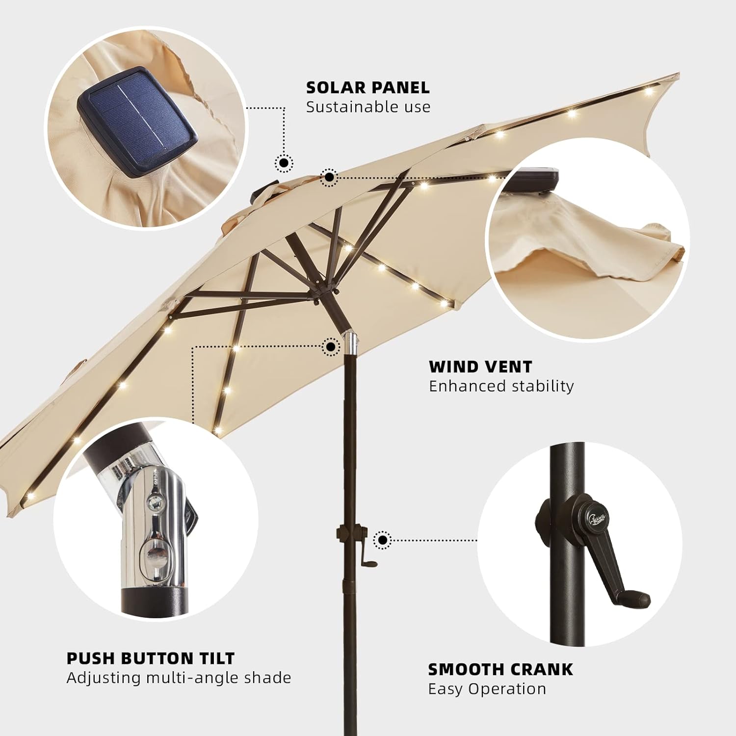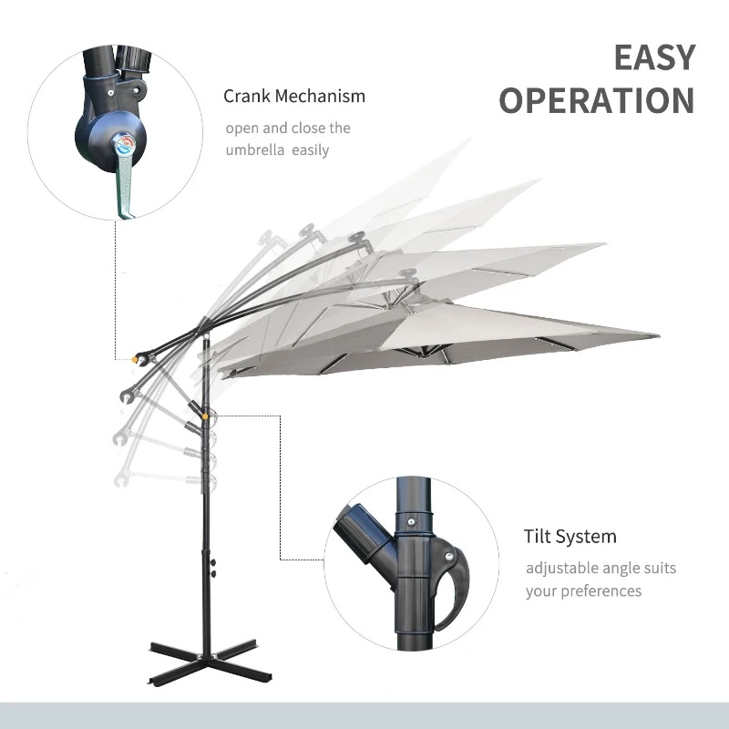 С лесната за използване манивела и функция за плавно отваряне и затваряне, този регулируем LED чадър ви позволява да настроите сянката според вашите нужди, като същевременно ви предоставя стилен и практичен аксесоар за всяко външно пространство.