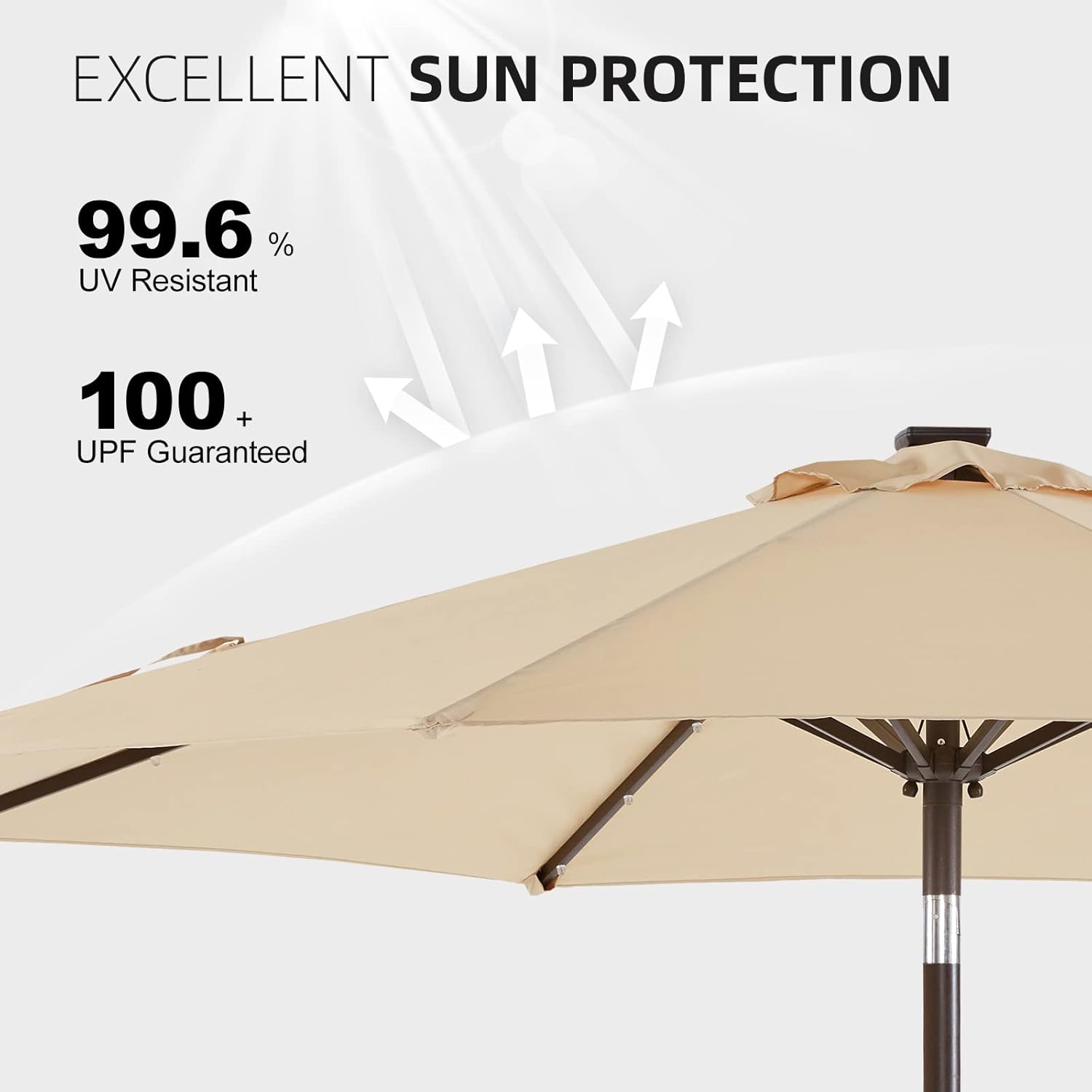 С подобрената си система за защита от вятър и стабилен автоматичен заключващ механизъм, този чадър предлага повишена устойчивост на люлеене и вятър. Неговите висококачествени компоненти – от манивелата до шарнирите и велкро лентите – са изработени от композит от найлон и фибростъкло за допълнителна здравина.