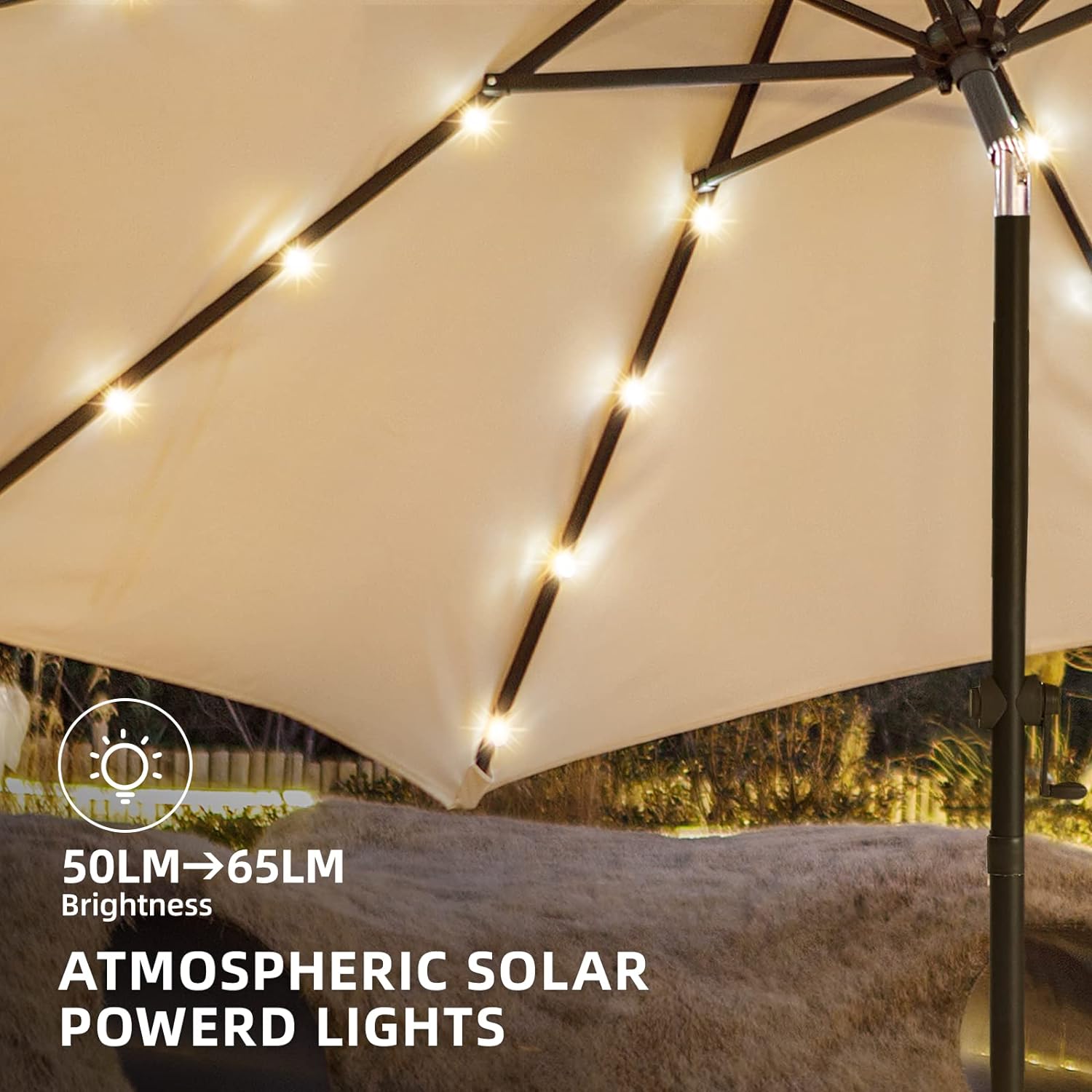 Добавете стил и функционалност към вашето външно пространство с висококачествения 3M градински чадър с LED осветление и UV защита. Този модерен чадър разполага с 32 вградени LED светлини, захранвани от соларен панел, които осигуряват меко осветление за 6-7 часа без необходимост от електричество – идеален за вечерни събирания или уютни вечери на открито.