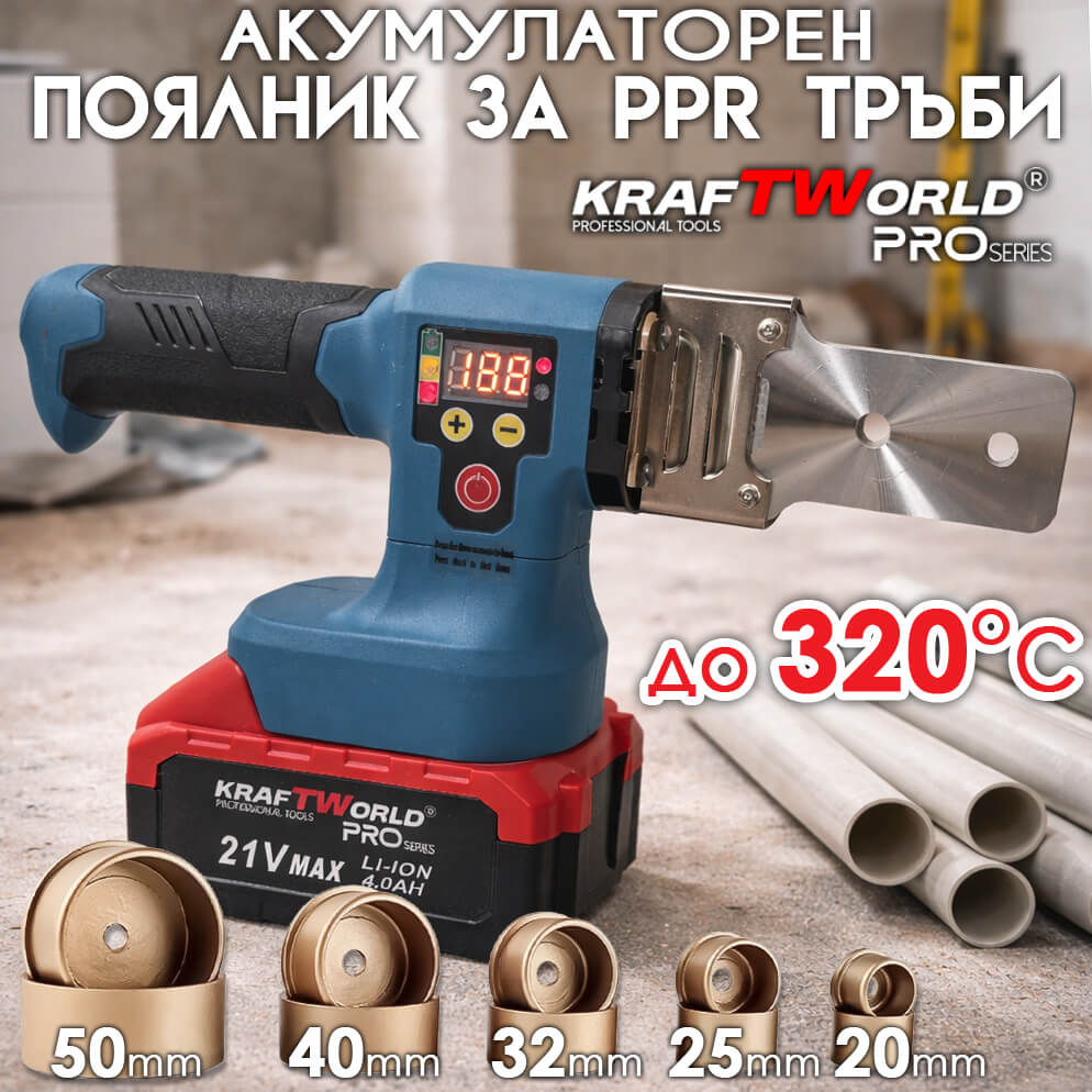 Акумулаторният поялник / лепачка за ППР тръби KraftWorld 21V с дисплей е модерен и практичен инструмент за бързо, точно и сигурно лепене на полипропиленови тръби 🔧🔥