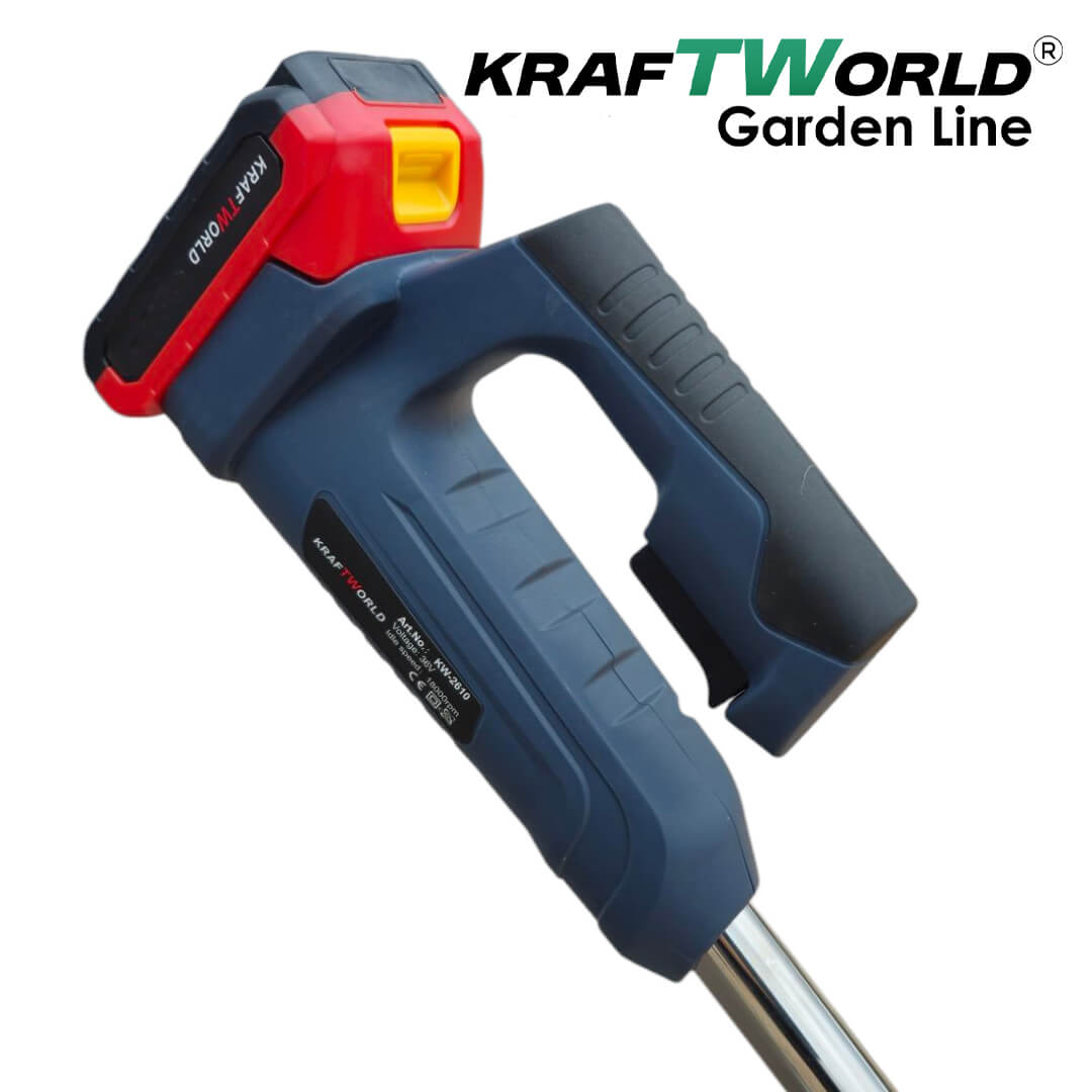 Основният инструмент в комплекта е акумулаторният тример, предназначен за косене на трева, оформяне на ръбове и премахване на плевели.
