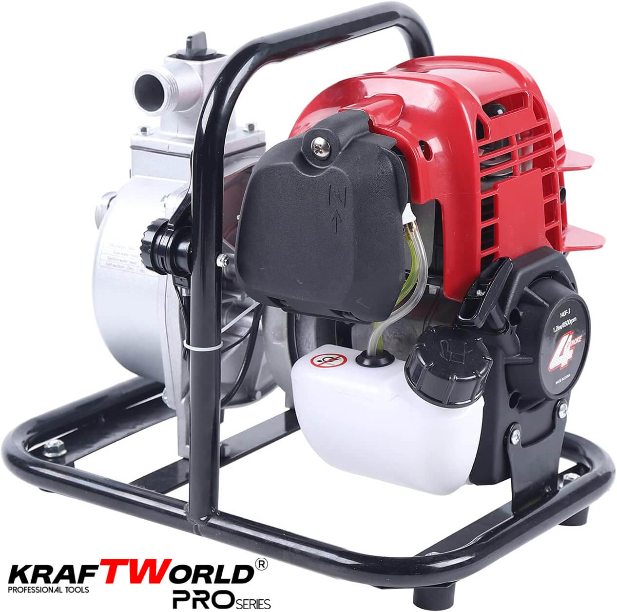 За разлика от 2-тактовите модели, тази водна помпа KraftWorld работи с 4-тактов двигател, което означава: