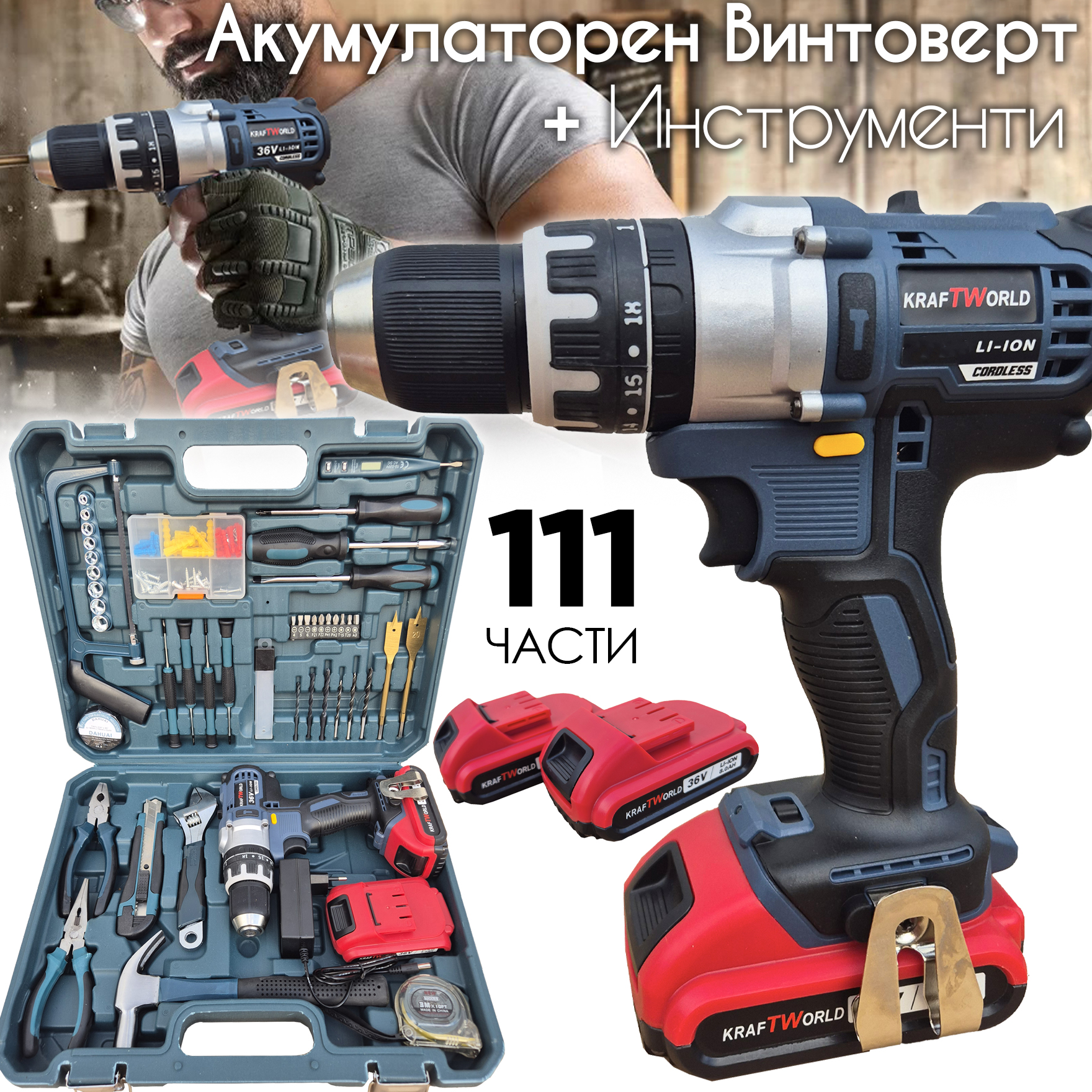 Винтоверт KraftWorld 21V – мощност, контрол и пълен комплект инструменти 🔧⚡