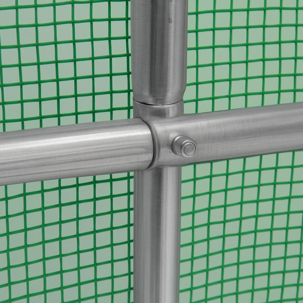 Изработена от двустранно поцинковани стоманени тръби Ф25 мм с дебелина 0.7 мм. Конструкцията е подсилена с напречни греди и стабилизиращи елементи в ъглите. Общо тегло 45 кг – това не е лека играчка, а сериозна оранжерия за реална употреба.