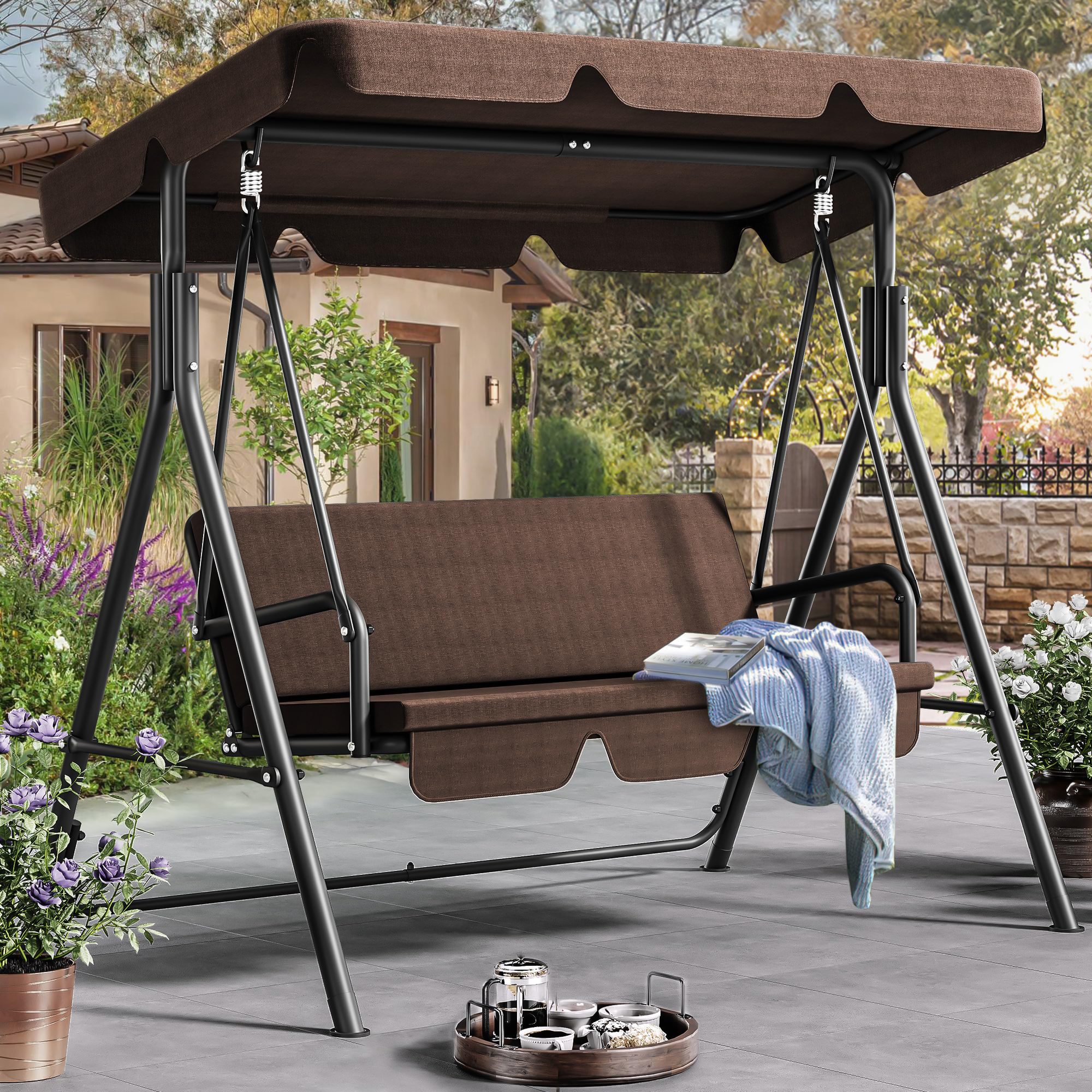 Люлката Тоскана в кафяв цвят създава усещане за уют и естествена хармония. Топлият тон се комбинира отлично с дървесни елементи, зеленина и класически градински пространства, придавайки завършен и спокоен вид на всяка външна зона.