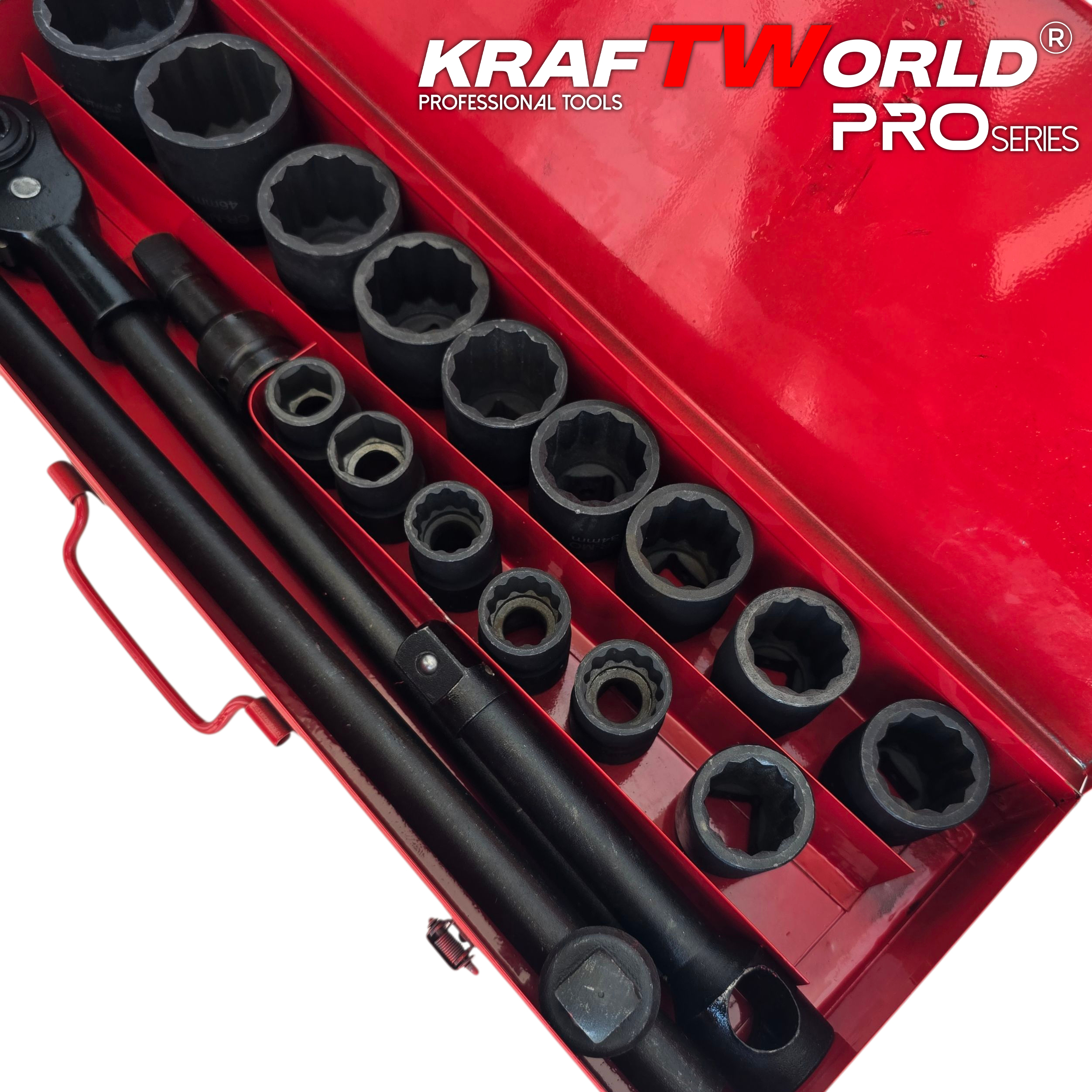 16 броя 12-стенни ударни вложки: 19, 21, 22, 23, 24, 26, 27, 28, 30, 32, 34, 36, 38, 41, 46, 50 мм