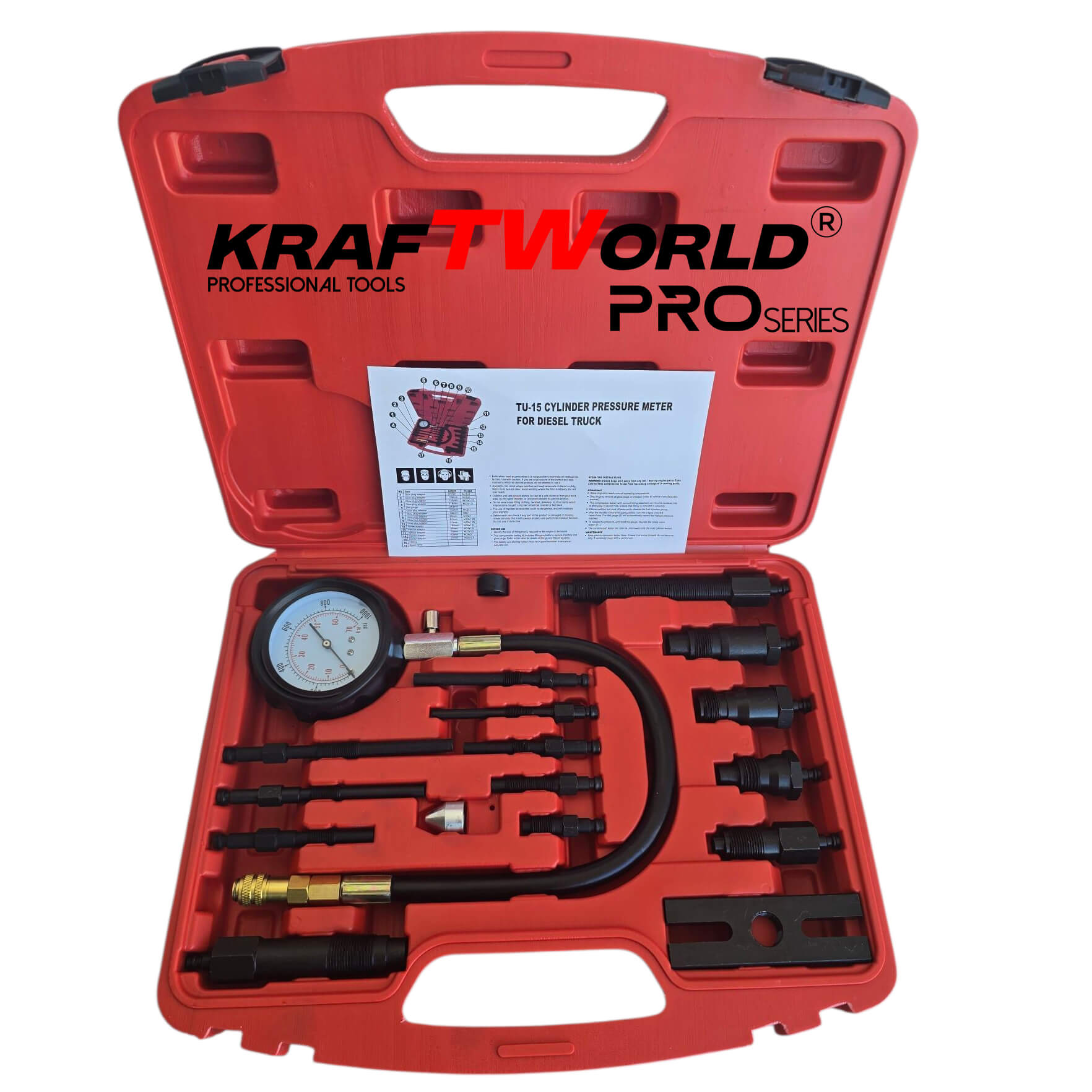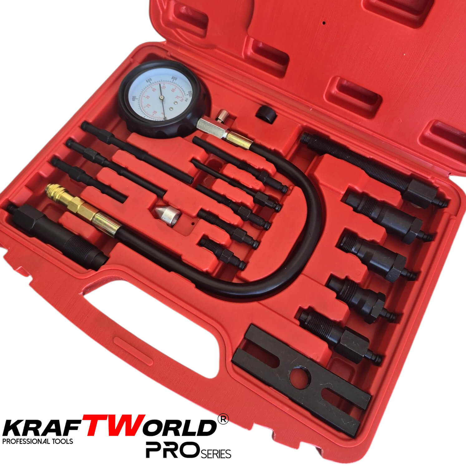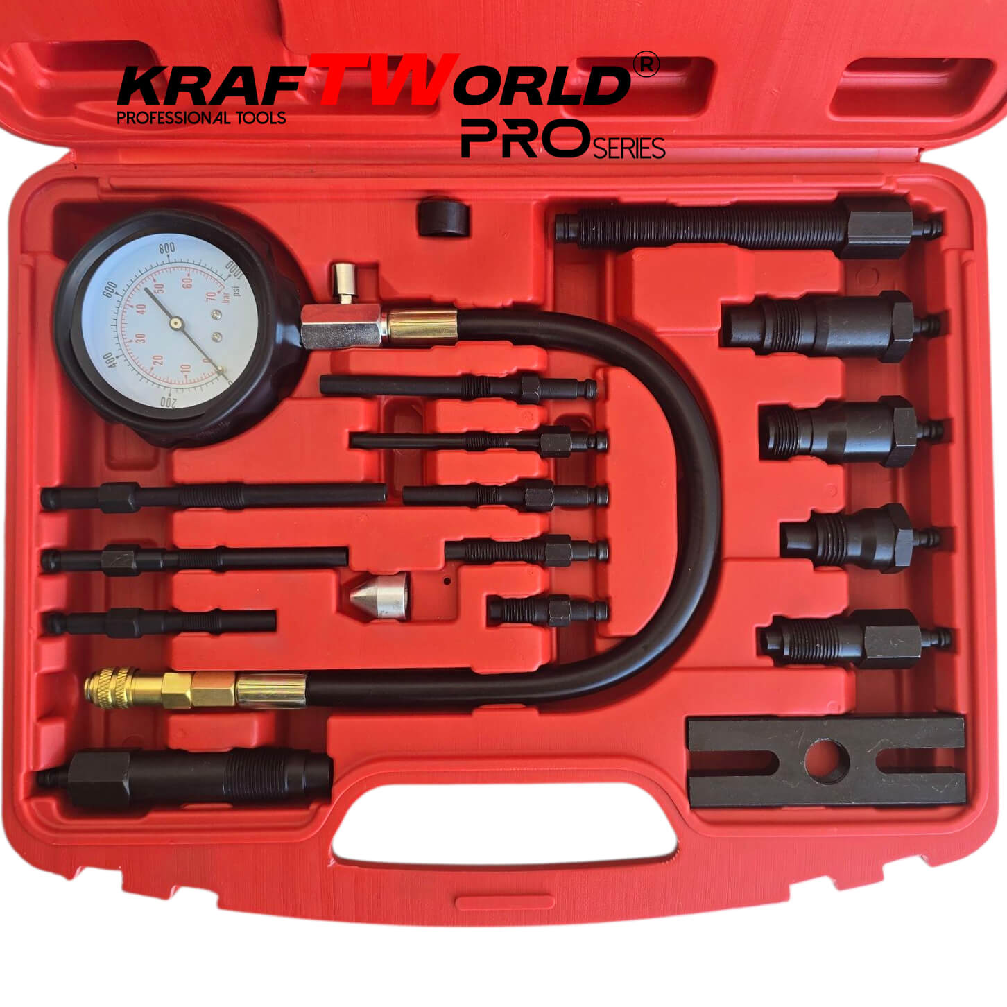 ???? KraftWorld Pro – Професионален комплект за измерване на компресия на дизелови двигатели (17 части)