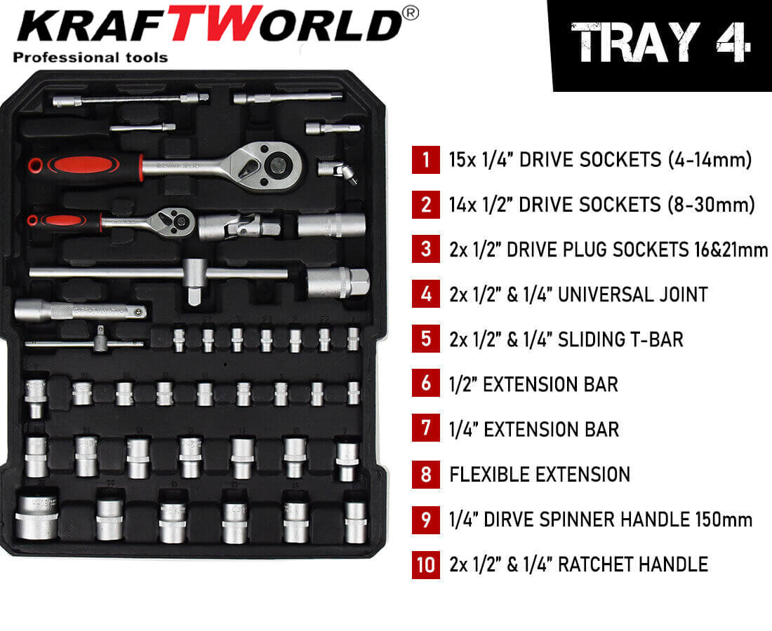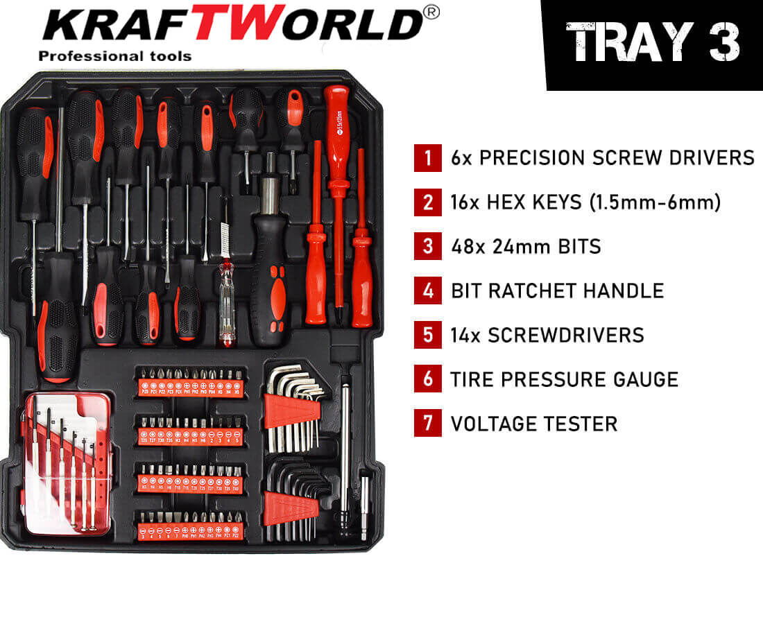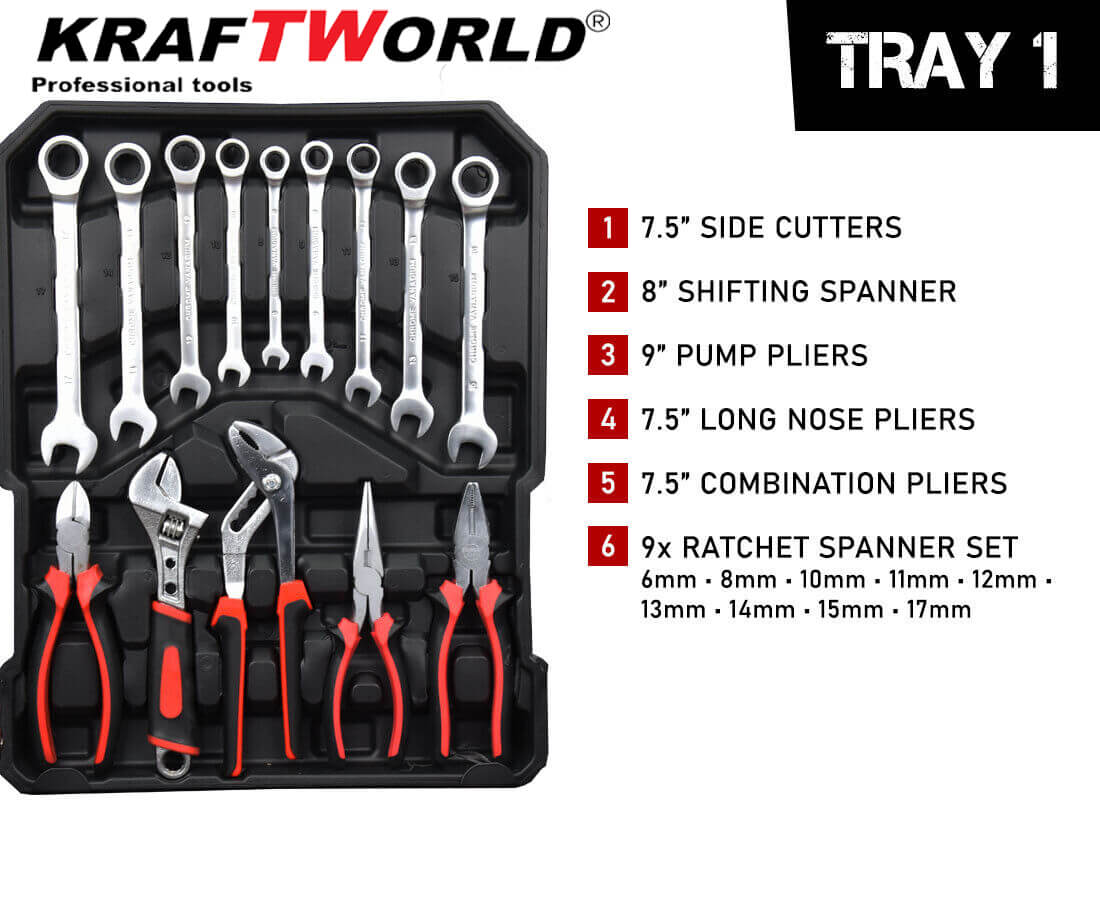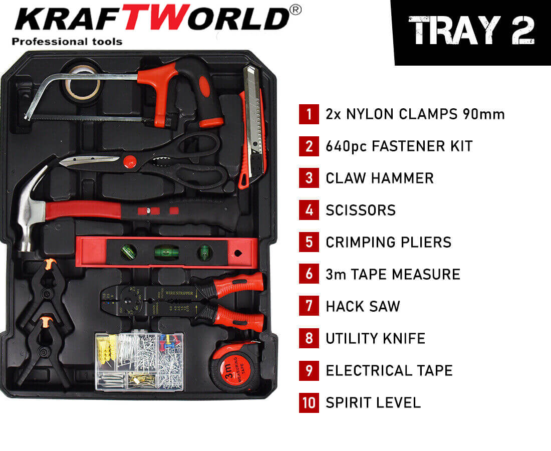 С куфара с инструменти 1200 части KraftWorld получавате богат комплект от инструменти, подредени удобно в здрав и мобилен куфар. Това е практично решение за всеки, който иска да има под ръка всички основни инструменти.