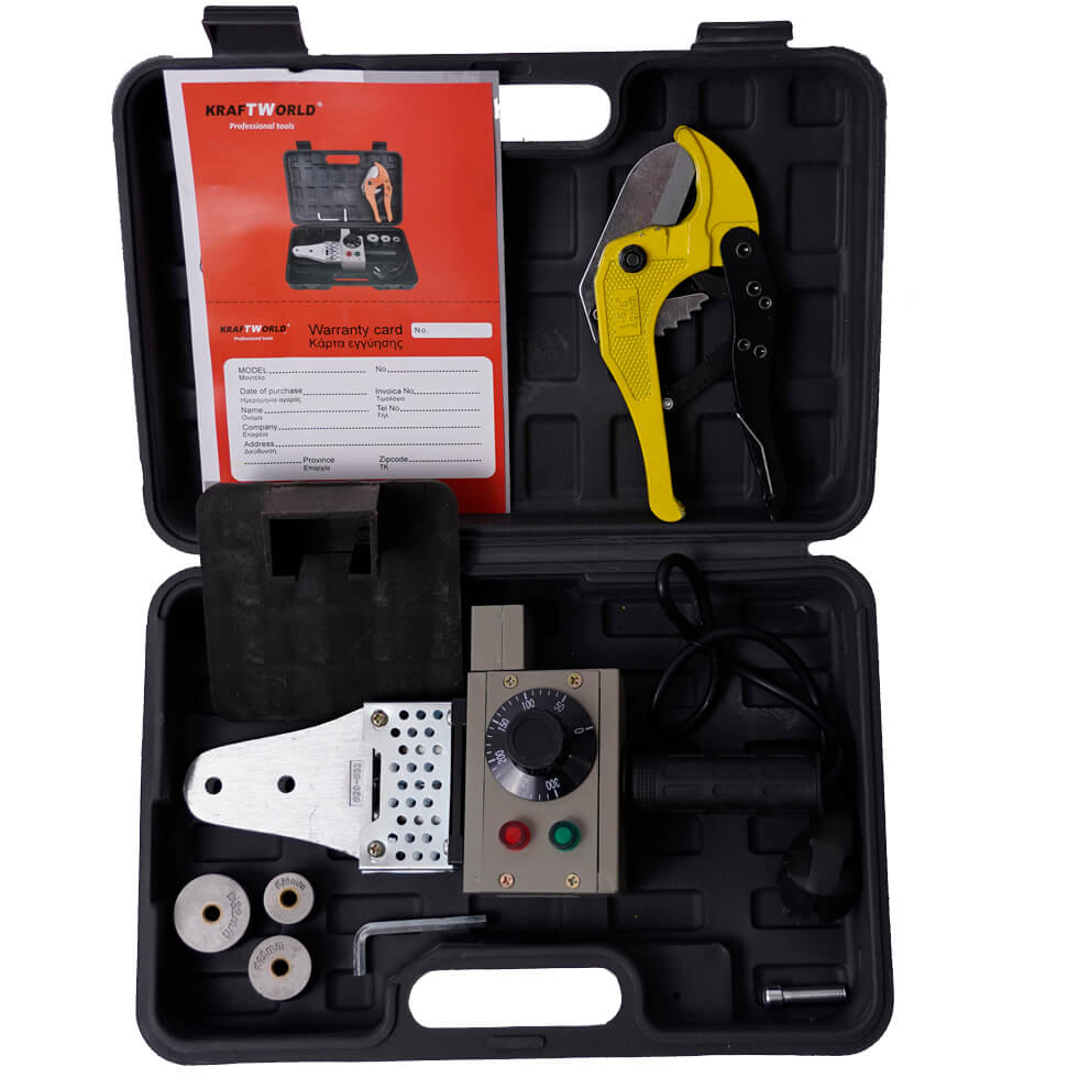 Инструмента е предназначен за топли връзки на полипропиленови тръби. Лепачката е с работно напрежение 220V, Мощност 800W и регулируема температура на главите до +300 °C. Лепачката KraftWorld за ППР тръби е компактно прибрана в удобен пластмасов куфар.
