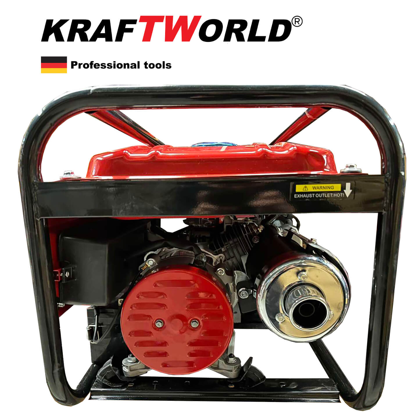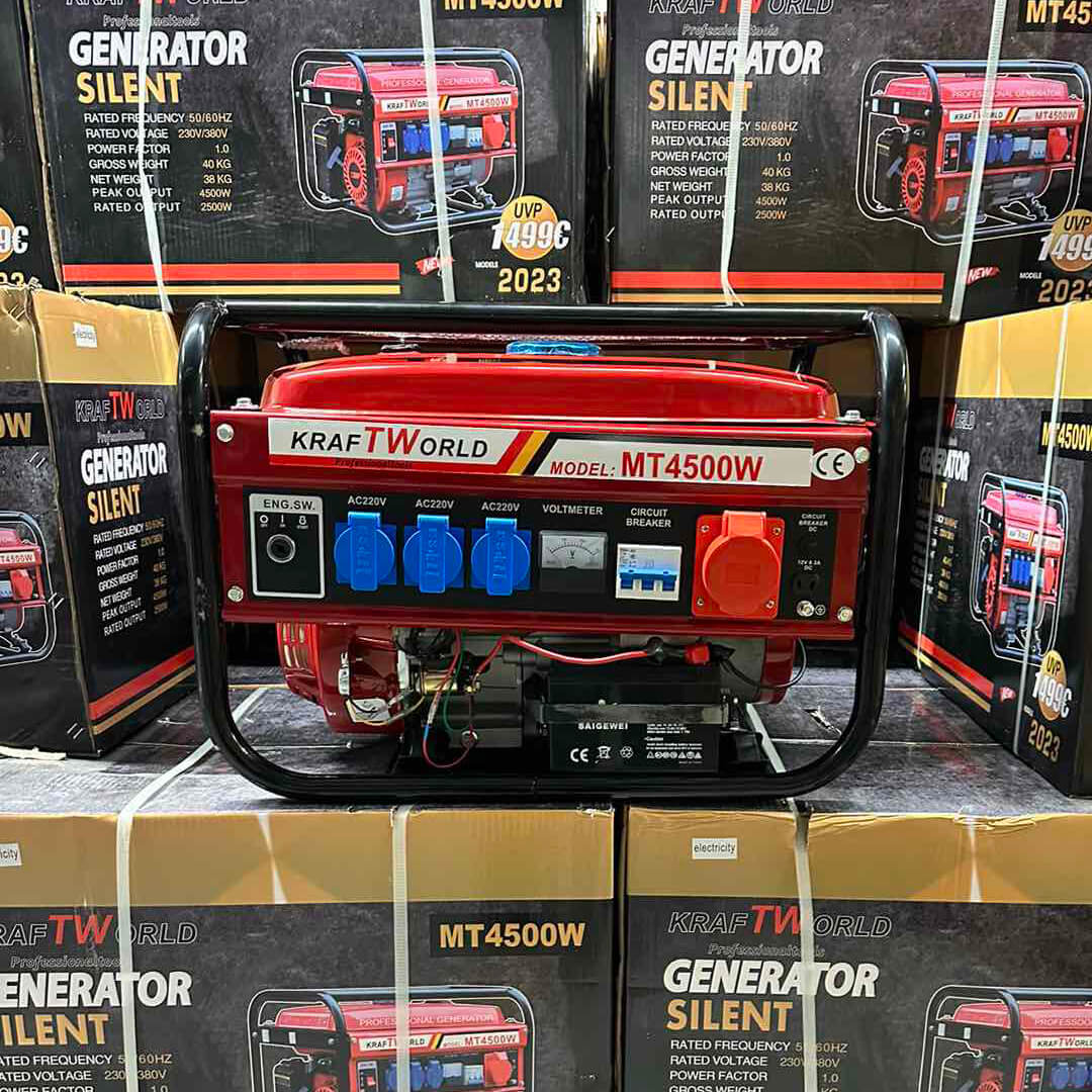 Електрогенератор MT4500W на KraftWorld е оборудван с акумулатор и елетростартер. Въвеждането в ход на мотогенератор, монофазен може да се осъществява електронно и ръчно. Автоматичното старт-стоп табло следи за нивото на заряд на акумулатора и при нужда го дозарежда до нужния заряд, за да може всеки път генератора да стартира безупречно.С двадесет и пет литровия резервоар за автомобилен, безоловен бензин ще ползвате агрегат KraftWorld по-дълго време, с по-редки прекъсвания за зареждане. Въздушно охлаждащият се, четиритактов мотор е с клапани, позиционирани над разпределителния вал. Генераторите са с медни ротори и статори. Бензинов Двигател VТR 800 с въздушно охлаждане, 6 конски сили. Вграден AVR /Automatic Voltage Regullator/- вградена платка за автоматично регулиране и стабилизиране на напрежението, автоматичен предпазител против претоварване на генератора. Автоматичен предпазител против претоварване на генератора. Магнетен стартер и автостартер с ключ и акумулатор.