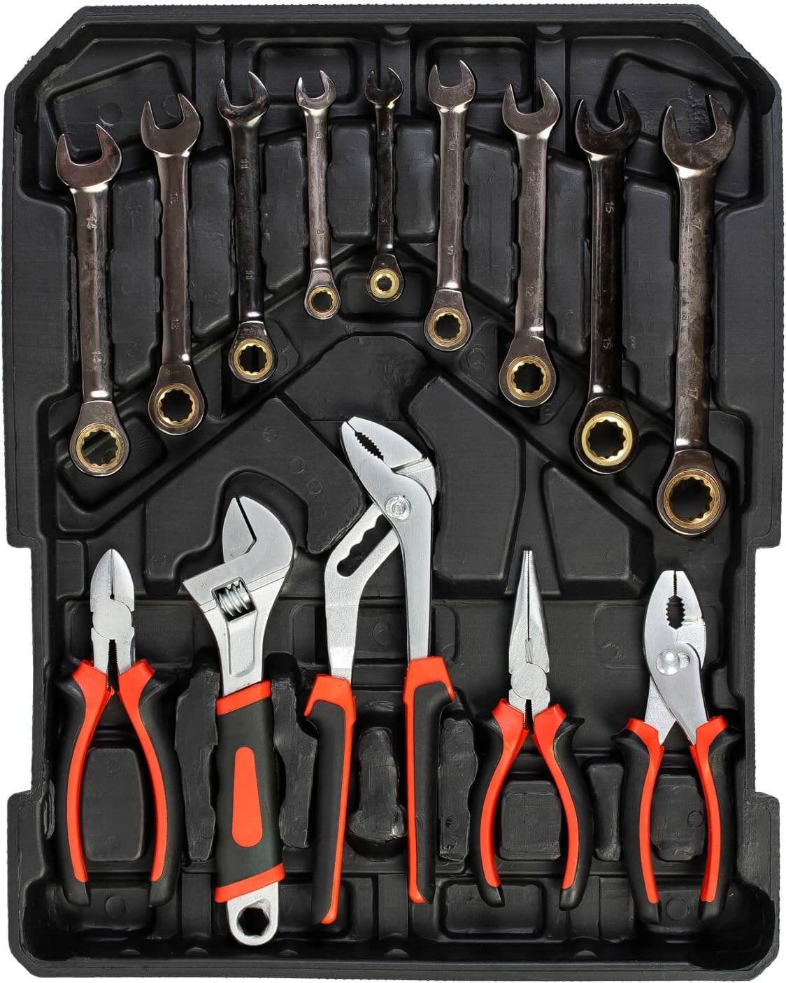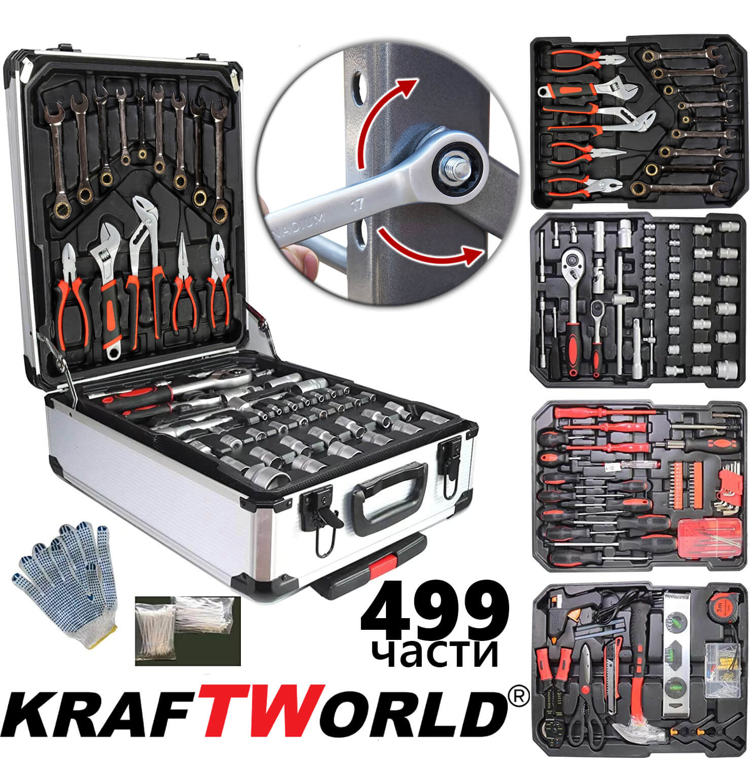 Куфар с инструменти 499 части KraftWorld – тресчотни ключове,тресчотка, клещи, отвертки
