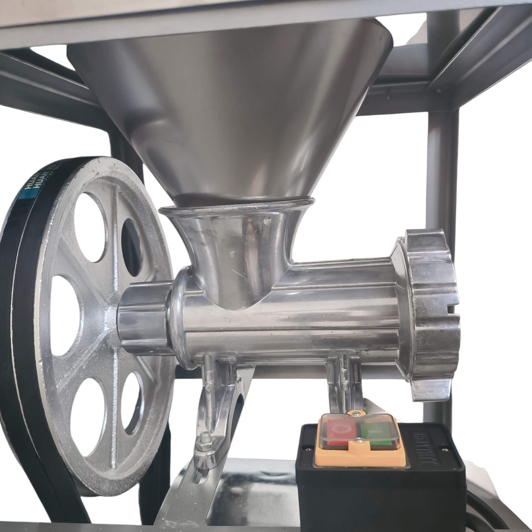 Работи с електромотор, свързан чрез ремъчно задвижване, което гарантира плавна работа и по-ниски вибрации. Голямата шайба поддържа постоянен въртящ момент и позволява работа без усилие дори при по-големи количества месо.
