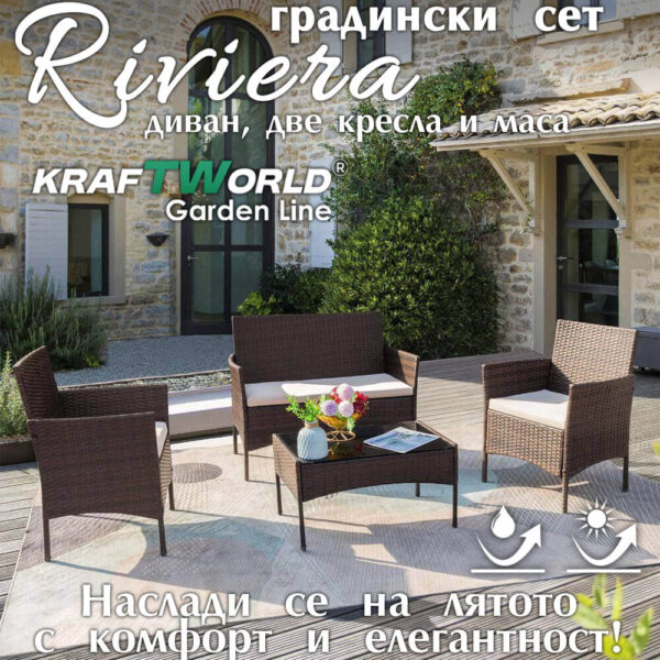 Градински комплект Riviera е изграден върху стабилна метална рамка, която гарантира дълъг живот и устойчивост при ежедневно ползване. PVC ратанът е устойчив на износване и не се деформира с времето.