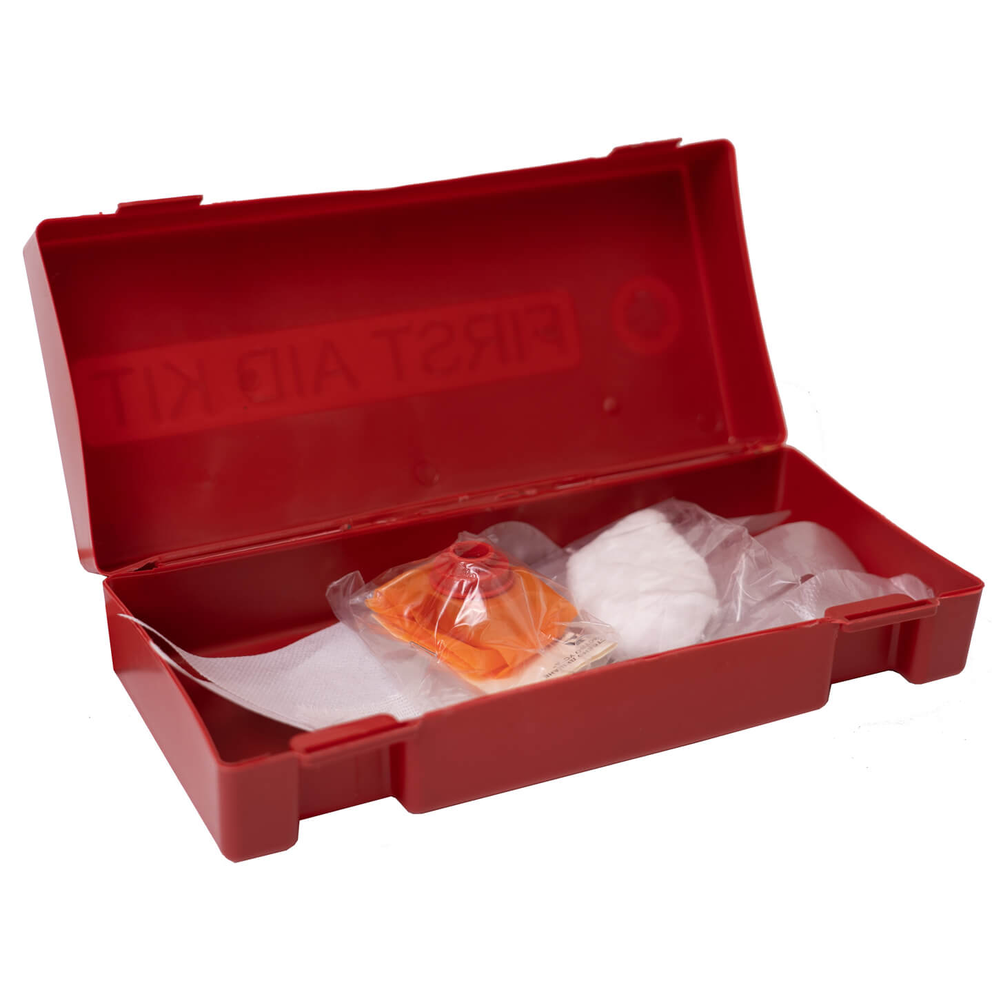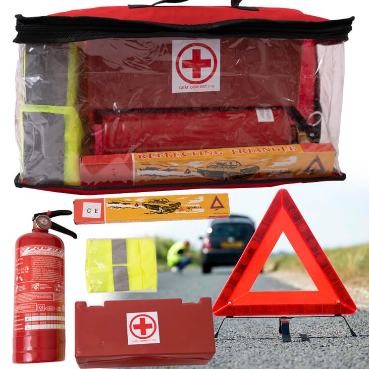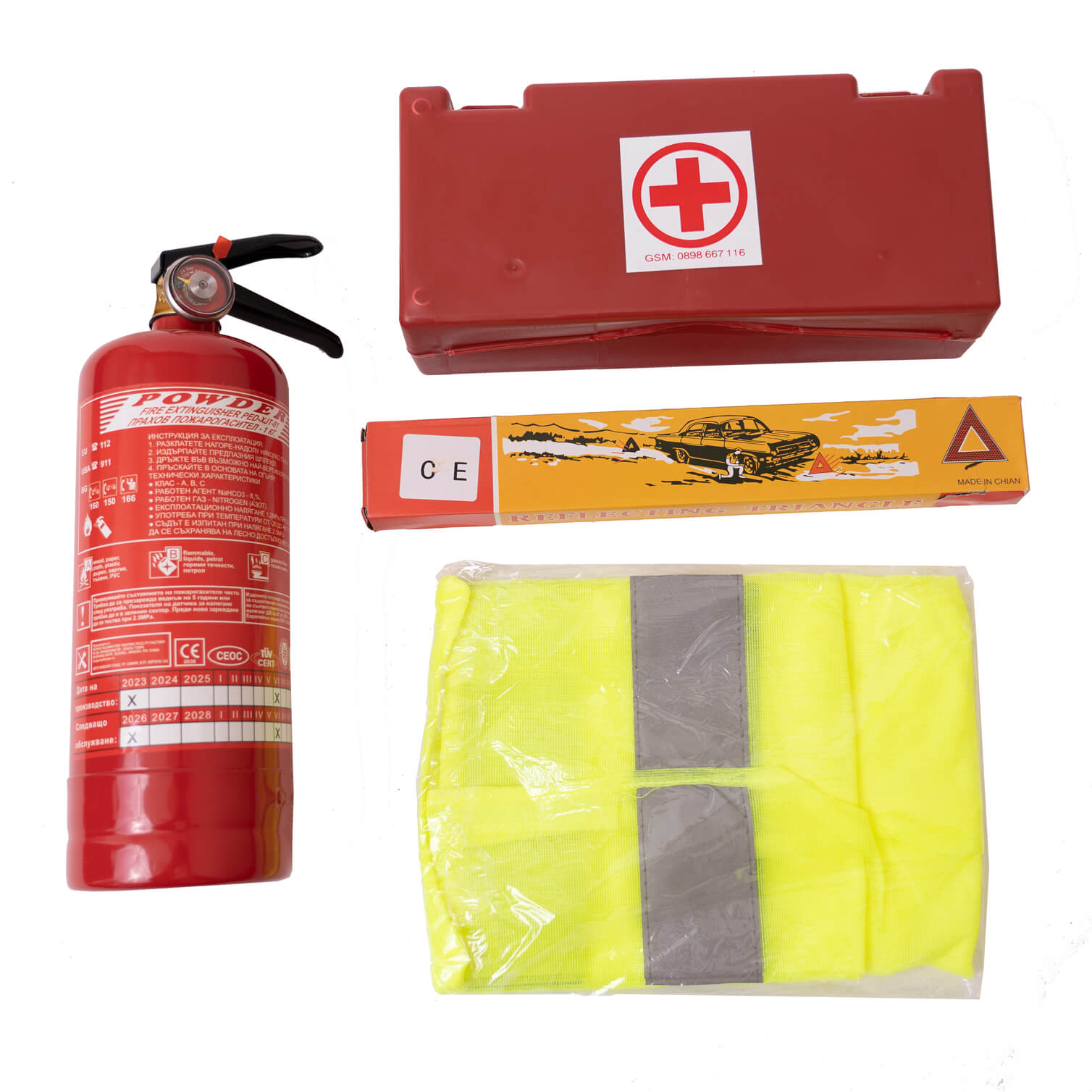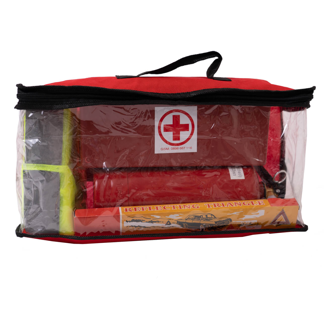 Авариен комплект за автомобил, компактно прибран в малка чантичка с цип и дръжка. Комплектът е подходящ и задължителен за всички автомобили в движение.